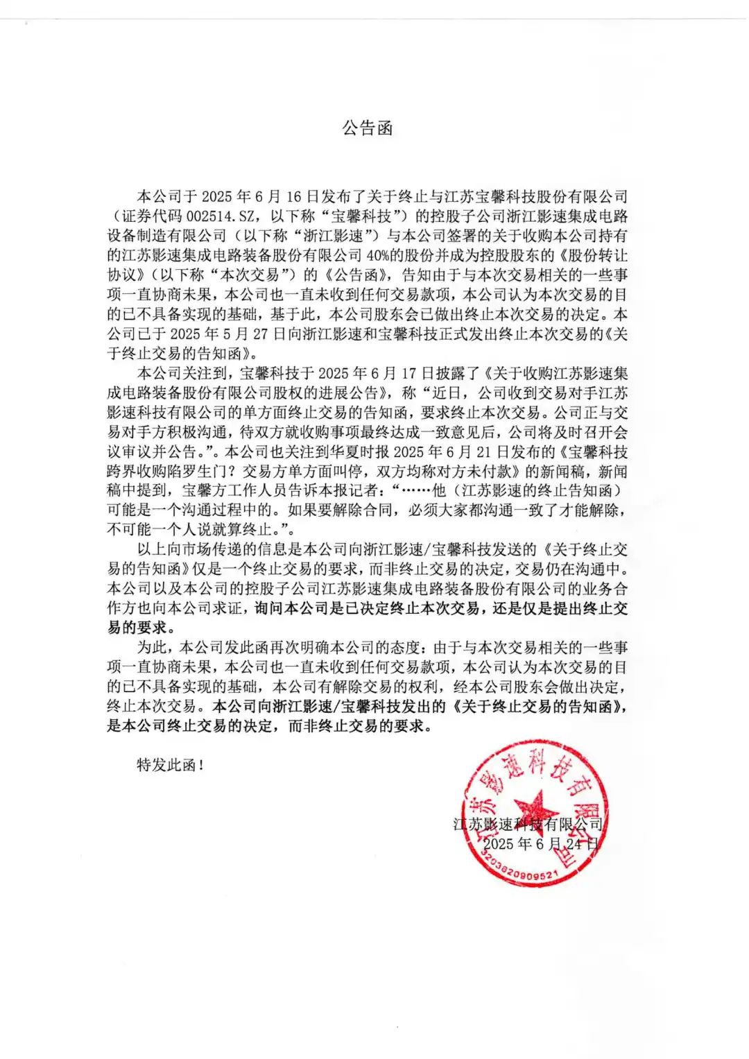 控股股东YY易游m6米乐科技已终止与宝馨科技(证券代码002514.SZ)的控股子公司浙江YY易游m6米乐关于收购本公司40%股份的交易